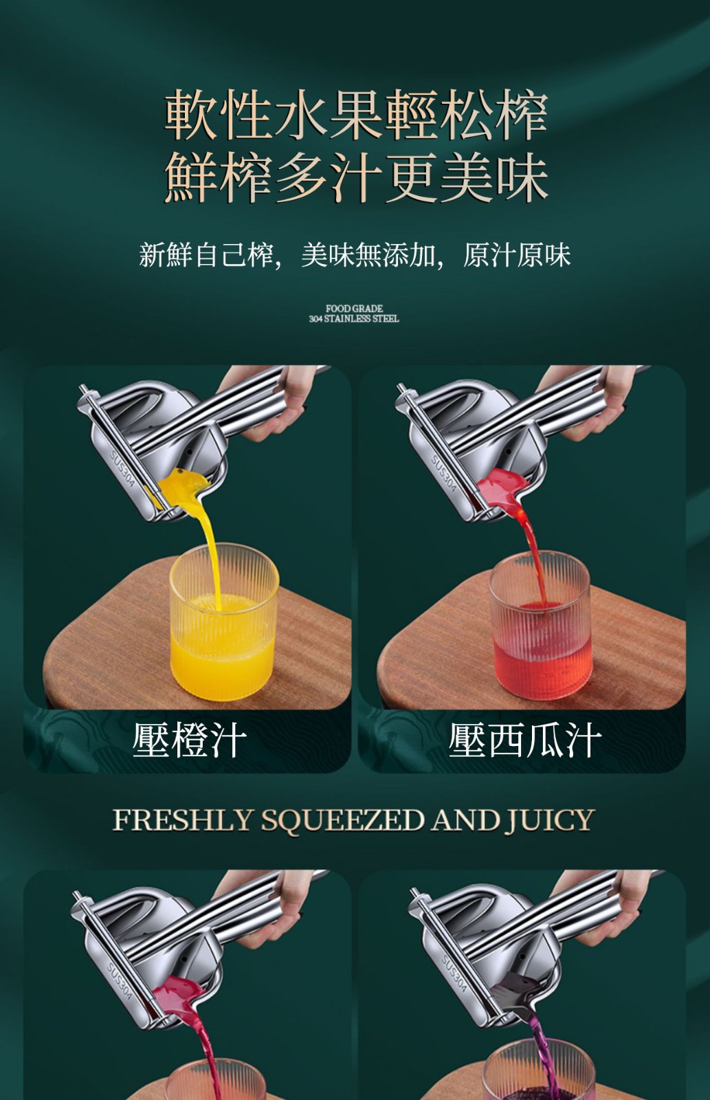 4分鐘前想喝鮮榨果汁宮又怕麻煩?304不鏽鋼手動榨汁汁來助力! 食品級材質安全耐用,鬆分離果渣與果汁,西瓜、石榴、柳丁随心榨!小巧便攜不佔地,手動按壓超解壓,新鮮健康零添加,讓你隨時隨地享原汁原味~ - 【限時下殺】買一送一 2入組NT$1298