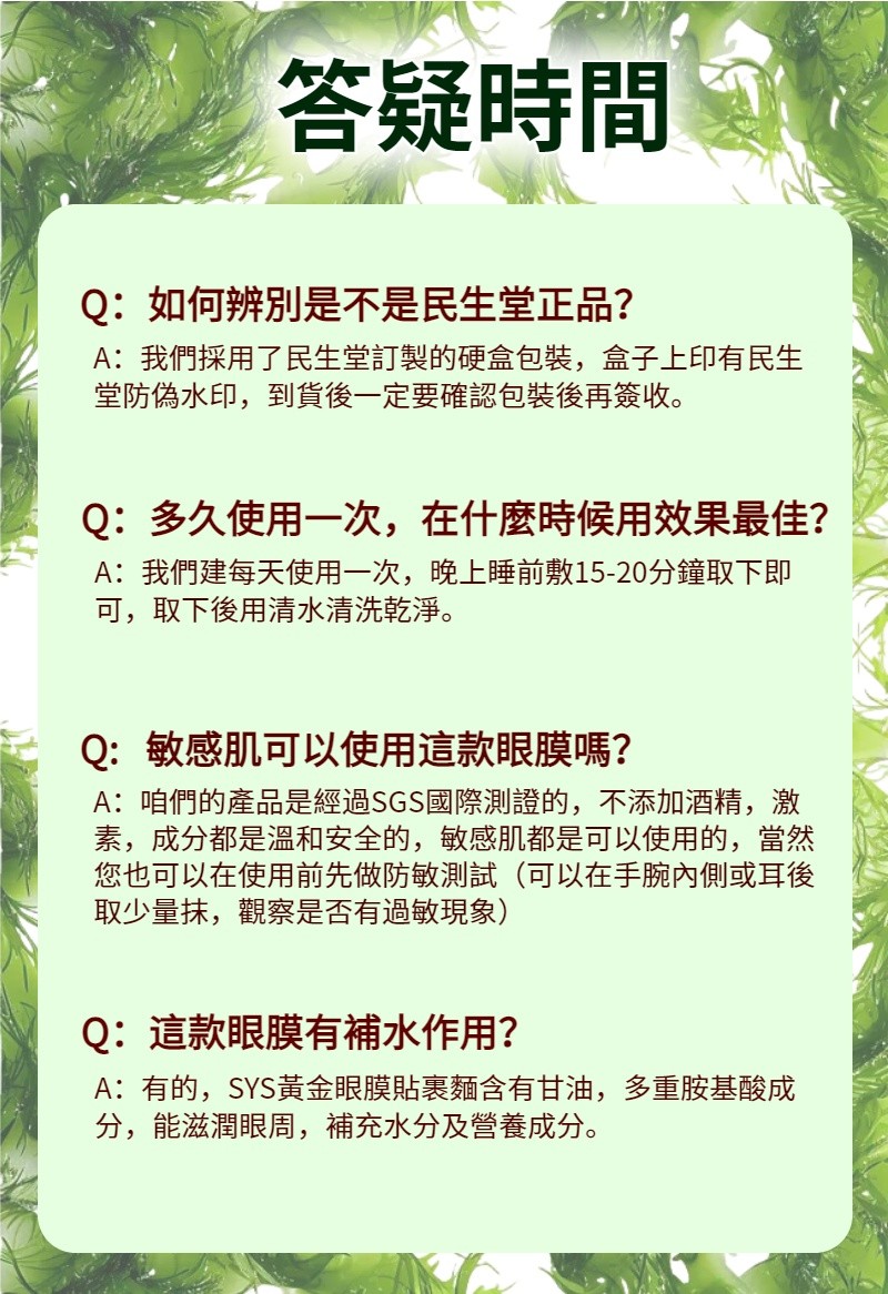 4分鐘前民生堂超值優惠大促【吳醫師特調推薦】綠海藻水晶眼膜 中藥成分 100%正品 好康開團~無效全額退 - 【分享裝,眼袋不反彈】買4送6 10罐 僅需NT$1998 均價199/罐