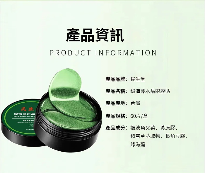 5分鐘前民生堂超值優惠大促【吳醫師特調推薦】綠海藻水晶眼膜 中藥成分 100%正品 好康開團~無效全額退 - 【體驗免運裝】2罐僅需NT$998